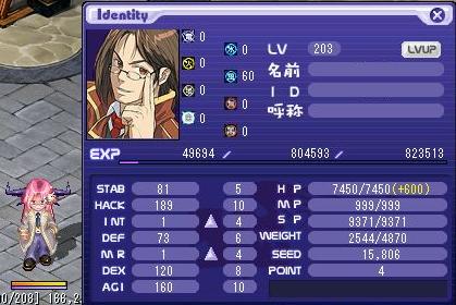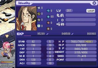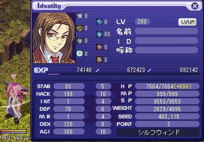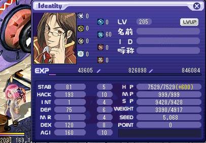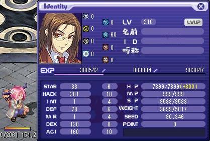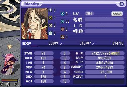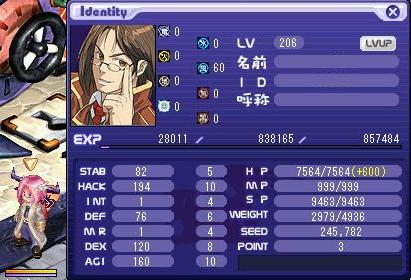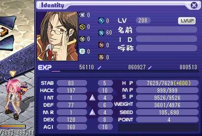 LV:210 STAB 211 HACK 125 INT 1 DEF 30 MR 1 DEX 120 AGI 150