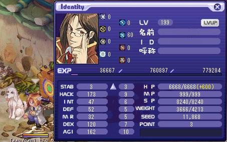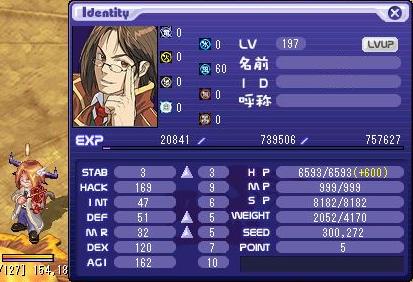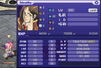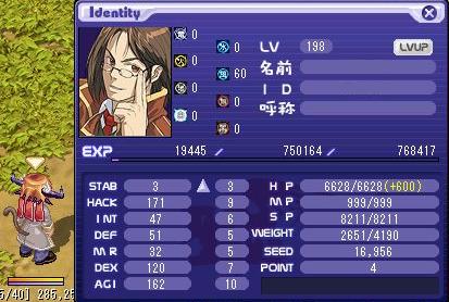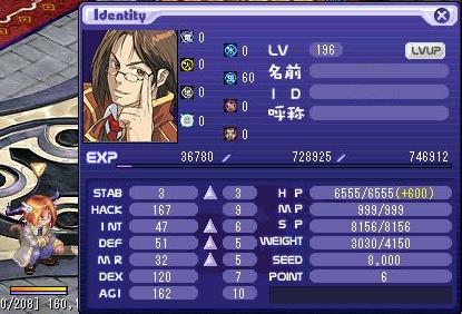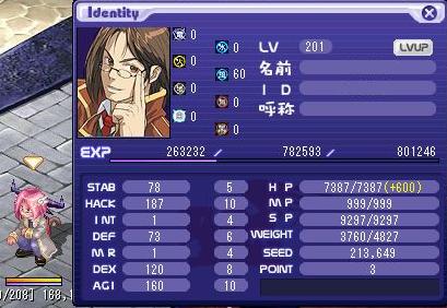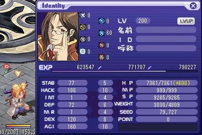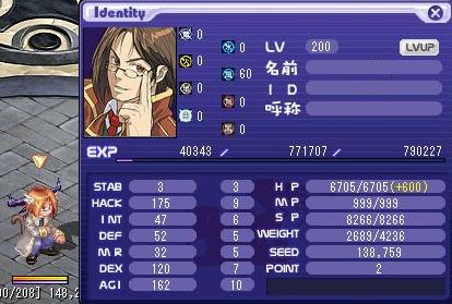 LV:200 STAB 77 HACK 186 INT 1 DEF 72 MR 1 DEX 120 AGI 160
